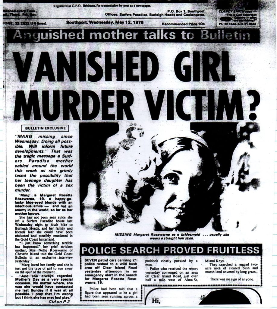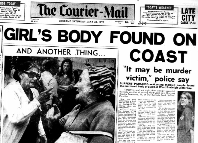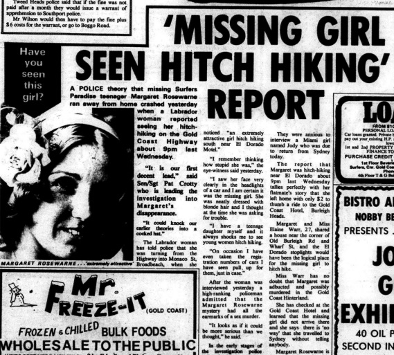 As the second youngest of 12 children, Margaret Rosewarne, 19, was believed to have disappeared whilst attempting to hitchhike from Broadbeach to Burleigh Heads on the evening of Wednesday 5th May to meet with friends at the Lounge Bar of the Gold Coast Hotel. After not returning to her parent’s home on Mother’s Day, Nellie subsequently told local newspaper The Gold Coast Bulletin of her overwhelming concern about Margie’s whereabouts: