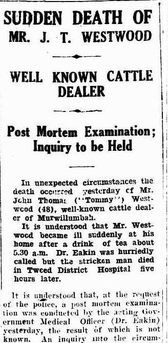 Sudden Death Of Mr JT Westwood: Well Known Cattle Dealer. Tweed Daily (Murwillumbah). 4 May 1932