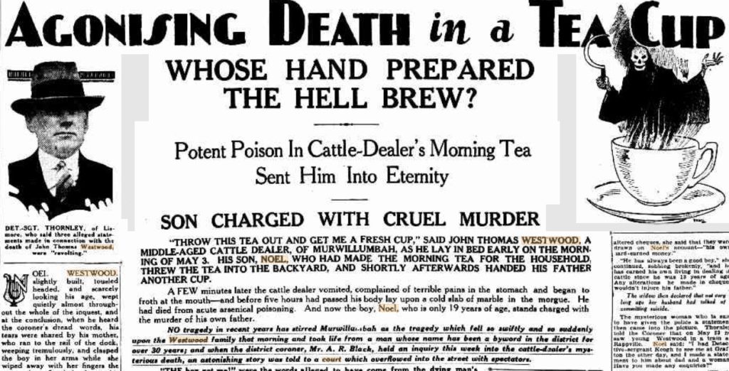 Given the circumstances of the Westwood poisoning, son Noel became the prime suspect of the investigators. He was questioned at the hospital by Sergeant Robert Lisle, officer in charge of police at Murwillumbah. The sergeant had already been furnished with information from Dr Eakin. Specifically, the last gasp verbal decree of the deceased that the “lad got me.”